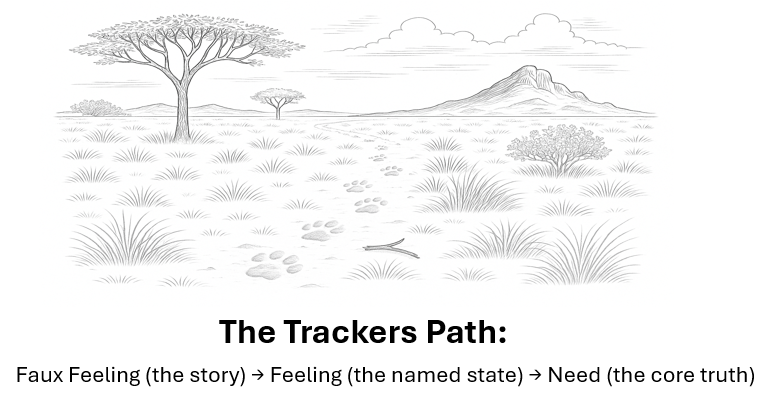 To name accurately, we need a path to follow—a clear sequence that takes us from the surface story to the truth beneath. I call this the tracker's path: from faux feeling (the story) to feeling (the named state) to need (the core truth). People arrive with conclusions.