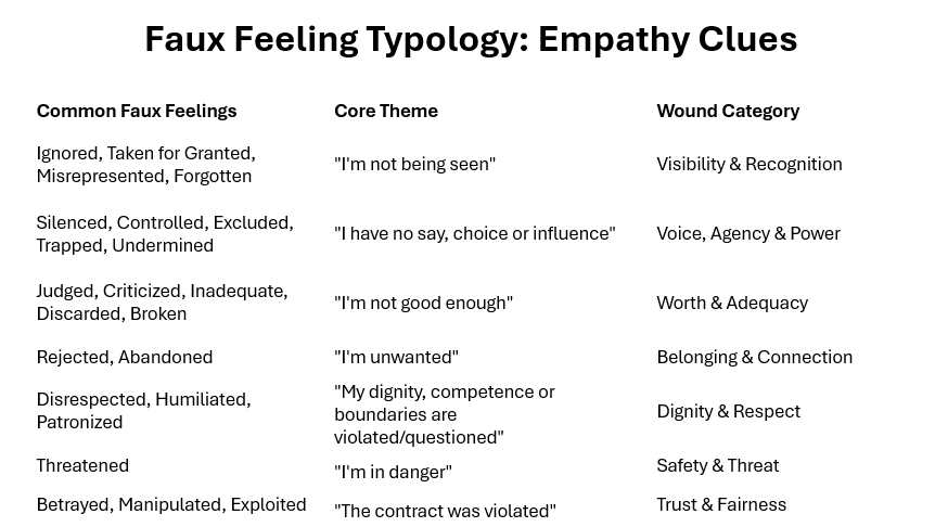 This isn't a rigid classification—faux feelings often cluster, with multiple wounds activated simultaneously. But the categories give mediators a quick diagnostic: What wound am I likely touching? What feelings and needs live in that territory?